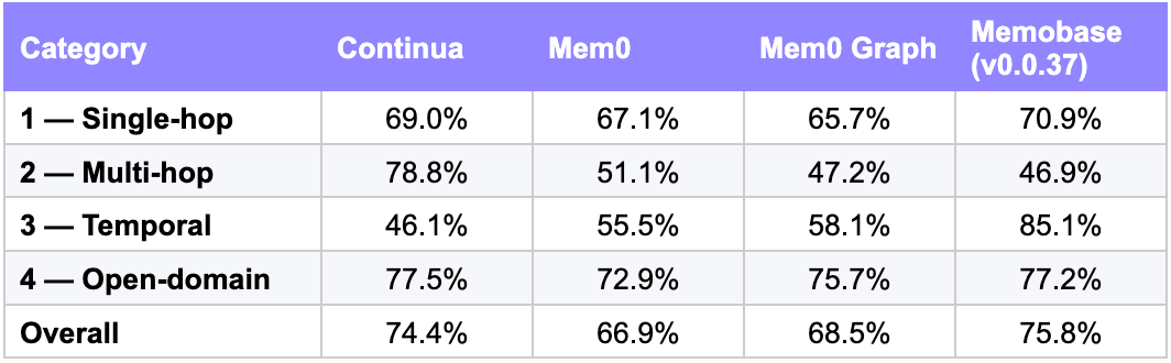 Under the identical baseline conditions (Mem0’s exact same prompts and models) Continua hit 74.4%. This represents a ~7.5pp lead over Mem0’s published 66.9%.